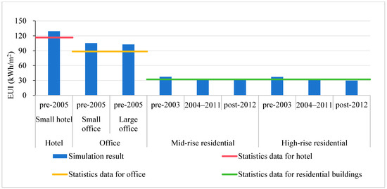 The baseline energy use intensity (EUI) is shown in Figure 6. The bar chart shows the simulation average results of the baseline. The horizontal line of Figure 6 represents the statistics EUI in actual society. The results for hotels and offices refer to the Report on Monitoring Energy Consumption of Large Public Buildings in Shenzhen (2022) [52], where the actual EUI of hotel buildings is 116.6 kWh/m2 and that of government office buildings is 88.5 kWh/m2. Li [53] analyzed the energy consumption of 580 households in Shenzhen. It was found that the average annual energy consumption was 32.18 kWh/m2, and the value between 1990 and 2004 was 20.26% higher than that of those built after 2005.