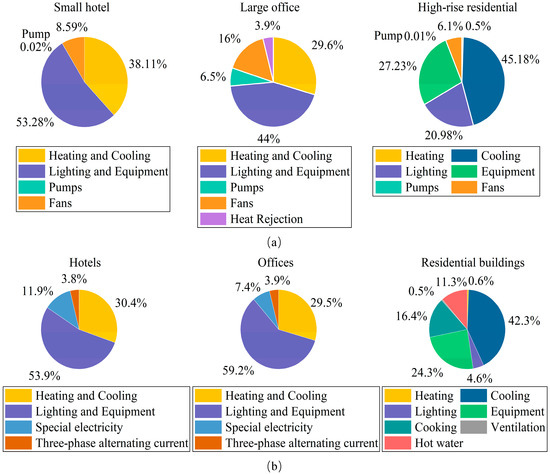 Components of energy consumption: (a) simulation result, (b) statistical data. Statistics data from Report on Monitoring Energy Consumption of Large Public Buildings in Shenzhen (2022) [52] and Factors Affecting Residential End-Use Energy: Multiple Regression Analysis Based on Buildings, Households, Lifestyles, and Equipment [54].