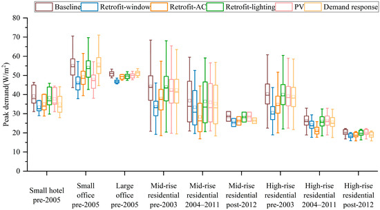 The distribution for peak demand is shown in Figure 8. The peak demand reduction rate is shown in Figure 9. Retrofit-window, retrofit-AC, and retrofit-lights can all reduce peak demand. Retrofit-windows have been identified as the optimal solution for buildings constructed before 2003 or 2005 in reducing peak demand. For residential buildings constructed between 2004 and 2011, retrofit-AC is the most effective scenario for mitigating peak demand. Adding PV equipment decreases peak demand for all building types. Small office buildings have the best reduction, indicating that it is more effective for small buildings than large ones, with a peak demand reduction rate of 10.54% for small offices and 2.08% for large offices. The range of small office buildings decreased from 43.57–70.58 W/m2 to 38.05–57.13 W/m2. The effect of adding PV on reducing peak demand for all building types except offices is not apparent, as PV generates electricity during the daytime, and the peak demand for other building types is staggered.