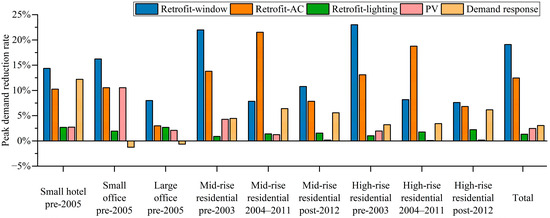 Considering peak demand reduction, the first consideration for buildings of all building types should be retrofit-windows. Still, the first consideration for residential buildings built between 2004 and 2011 should be retrofit-AC. Overall, small hotels tend to implement demand response more effectively than retrofit-AC. However, there is considerable variation in the effectiveness of demand response among small hotels, highlighting the need to assess the specific impact of retrofit-AC and demand response on individual buildings. For small office buildings, in addition to retrofitting windows, both retrofit-AC and adding PV achieve desirable results, while for large office buildings, retrofit-windows are significantly more effective than other scenarios.
