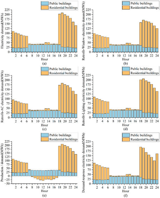 After the retrofit, electricity demand decreases in all periods. The period from 17:00 to 23:00 remains the peak demand period, but the difference between the peak and valley periods decreases. Window replacement works best, followed by AC and lights. PV equipment has a more significant impact on reducing energy consumption in residential buildings than public buildings. From 7:00 to 17:00, residential buildings shift from electricity consumers to producers, exporting power to the outside world. From 17:00 to 23:00, it is still the peak demand period, and a decrease in energy consumption is not apparent. The demand response is applied from 17:00 to 23:00. Compared with the baseline energy consumption, there is a slight decrease from 17:00 to 18:00. From 17:00 to 23:00, the energy consumption shows a gradual decline. After 23:00, the demand response is no longer implemented, but there is a visible increase in energy consumption.
