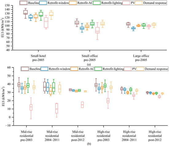 Considering energy savings, adding PV is the most effective scenario for residential and small public buildings in regard to reducing EUI. Second, for buildings constructed before 2005, retrofit-windows should be prioritized. For buildings constructed in 2004–2011, retrofit-AC is more necessary than retrofit-windows. The energy savings from retrofit-lighting and demand response are less pronounced.
