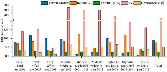 The distribution for EUI is shown in Figure 11. The EUI reduction rate is shown in Figure 12. Retrofit-windows effectively reduce the EUI and narrow the EUI gap between buildings (for example, the range of hotel buildings decreased from 118.11–142.61 kWh/m2 to 112.79–127.86 kWh/m2). Buildings constructed earlier exhibit a higher rate of EUI reduction. For all types of buildings constructed before 2005, the EUI reduction rate for retrofit-windows ranges from 8.02% to 12.01%. Meanwhile, for buildings constructed after 2005, the EUI reduction rate is less than 2.23%. Furthermore, retrofit-AC contributes to EUI reduction. The high EUI reduction rate for residential buildings built in 2004–2011 is due to the better performance of the envelope compared to buildings built before 2003, and the performance of AC is not as efficient as that of the buildings built after 2012. Retrofit-lighting saved energy in all building types, with EUI reductions ranging from 2.11% to 3.63%, with little difference between each building type.