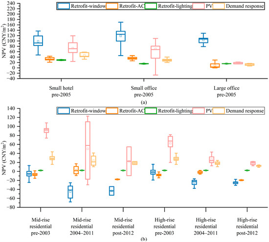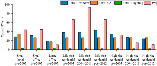The cost is shown in Figure 13. Retrofit-lighting has a low initial investment of no more than 3.62 CNY/m2. The cost of adding PV is highest for small public buildings, reaching 44.24 CNY/m2 for small hotels and 44.66 CNY/m2 for small office buildings. Retrofit-window and retrofit-AC costs are higher for small public buildings than for large ones. For mid-rise residential buildings, the cost of PV is the highest, followed by retrofit-windows and retrofit-AC. For high-rise residential buildings, the cost of replacing windows is higher than that of adding PV.