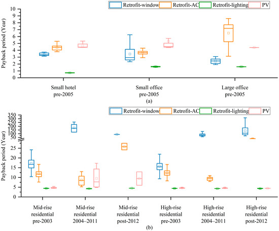 The PBP is shown in Figure 14. Since demand response has no initial investment, its PBP is not calculated. Typically, windows and PV have a 20-year lifespan, and the lighting and AC have a 10-year lifespan. The PBP for public and residential buildings differs significantly. The PBP for every scenario for public buildings does not exceed 10 years and can recover the cost before the end of life. Retrofit lighting has the shortest PBP, at no more than 1.67 years. For residential buildings, retrofitting lighting and adding PV can recover the cost before the end of life. The difference in PBP for retrofit lighting is minor, never exceeding 4.54 years. The PBP for PV in high-rise residential buildings is shorter than in mid-rise residential buildings. For residential buildings constructed after 2004, the PBP for retrofit-windows is too long to recommend retrofitting. For buildings constructed before 2003, more than 75% of buildings with retrofit windows will pay for themselves before the end of their useful life. Retrofit-AC is not recommended for residential buildings constructed after 2012, and retrofit-AC is more effective for residential buildings constructed between 2004 and 2011 than for buildings constructed before 2003, with just under 25% of residential buildings constructed before 2003 and more than half of buildings constructed between 2004 and 2011 covering costs.