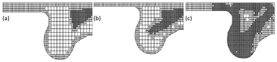 Different grid refinements by CONVERGETM, (a) −14.3 °ATDC; (b) −3.9 °ATDC; (c) +10.0 °ATDC.