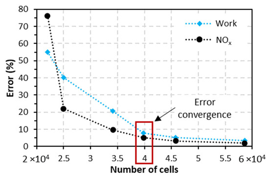 As a first step, a meshing study is carried out. The engine speed for this section is set at 910 RPM based on available results [29]. As shown in Figure 3, this study is based on the convergence of the relative error on indicated work and NOx emissions. This relative error is calculated as the error of the numerical model compared with the experimental results. According to these results, this convergence is achieved for a cell number of 4 × 104, where the error on both parameters is deemed acceptable, taking into consideration its effect on calculation time (8.26% and 6.53% on indicated work and NOx, respectively).