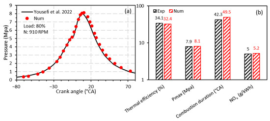 After the meshing study, validation of the numerical tool is essential in this work. For the validation case, the engine operates in dual fuel mode at 80% of the full load and a speed of 910 RPM. The primary fuel (ammonia) and the pilot fuel (diesel) provide 85% and 15% of the total energy developed, respectively. Figure 4a shows a comparison between the numerical and experimental pressure signals [29], where agreement between the two is considered acceptable with an error of 4.28%. Figure 4b shows a comparison in terms of indicated thermal efficiency, combustion time, maximum pressure and NOx emissions. The combustion time (or combustion duration) is represented by CA10-CA90, which refers to the crank angle duration between 10% and 90% of the cumulative heat release during the combustion process. The minor differences observed are mainly due to the uncertainties of the physical-chemical models used, which strongly validates the global CFD model used in this work.