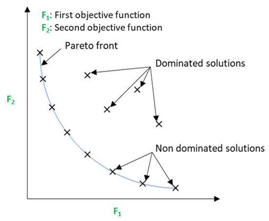 NSGA-II, developed by Deb et al. [37], extends its predecessor NSGA by incorporating significant improvements for solving problems related to dominated solutions and convergence to the Pareto front encompassing all dominant optimal solutions, as illustrated in Figure 5 for a problem with two objective functions.