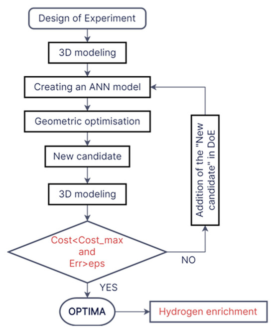 The incorporation of the “experiment space refinement (ESR)” methodology stands as a pivotal phase in guaranteeing the precision of the model. This procedure entails the selection of a refinement point (Pr) through the application of the “max-min distance” criterion, as outlined in Equation (4). The purpose is to systematically investigate uncharted territories within the experimental design. Afterward, the identified refinement point is evaluated using the constructed meta-model and CFD to determine the relative error. If this error (Err) exceeds a critical threshold (eps), the point is reconsidered in the creation of the meta-model via an iterative loop. Otherwise, or if the cost (Cost) reaches its maximum (Cost_max), the iterative loop stops and provides the optimal solution [48].