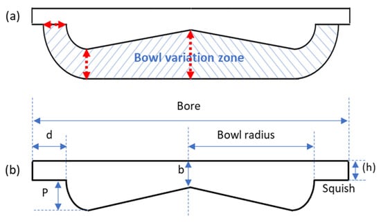 The optimizer controls the three parameters (P, b, and d), ensuring that geometries can be achieved with the same compression ratio, and controls the swirl rate (S) limited by mechanical conditions directly linked to the creation of the swirl aspect. The final goal is to minimize the NOx rate according to the first objective function, and maximize a weighting between indicated thermal efficiency and combustion efficiency according to a second objective function as defined by Equation (1), ensuring fixed energy input for all optimization cases.