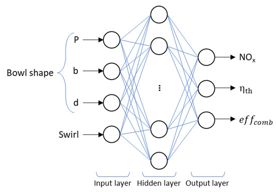 The ANN modeling tool has proven its wide-ranging ability to predict real-time performance and emissions in internal combustion engine applications [42,43,44]. ANN is a computational model inspired by the structure of the human brain, consisting of interconnected nodes called artificial neurons. These neurons are organized in layers and transmit signals through weighted connections. The architecture of an ANN is defined by its layers, the neurons embedded within those layers, the training algorithm employed, and the activation function applied to each layer. These elements collectively contribute to the formation of network architectures [45], as illustrated in Figure 8.