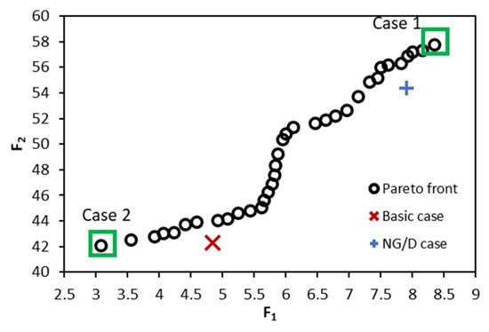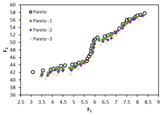 Figure 9 shows a history of the last four Pareto fronts according to the global optimization loop presented by the flowchart in Figure 6 which satisfies the two objective functions (F1 and F2) defined by Equation (1).