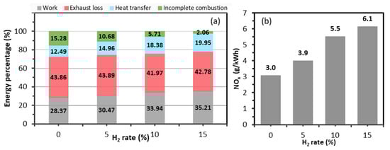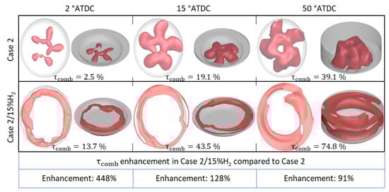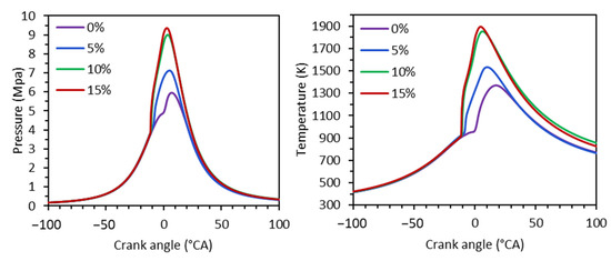 A comparison of the results in Table 9 with Table 6 reveals that Case 2/15%H2 offers an indicated thermal efficiency improvement of 32% and 13% compared with the base case and NG/D case, respectively. This efficiency improvement is accompanied by an increase in NOx of around 26% compared with the base case, and a reduction of over 22% compared with the NG/D case.