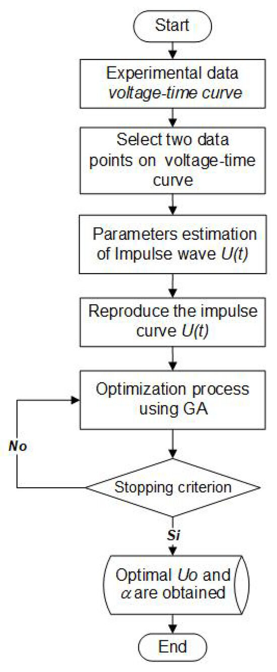 The methodology proposed in this paper to obtain the parameters of Kind’s and Chowdhuri’s models is illustrated in Figure 2. It starts by obtaining the voltage-time curve data of the insulation system under study and its corresponding statistical analysis; then, it proceeds with the estimation of the parameters of the standard voltage impulse waveform using voltage values obtained at different points of the voltage-time curve and taken as the peak-values to reproduce the . Finally, the parameters of the models presented in Equations (2) and (3) are estimated by solving an optimization problem through a GA.