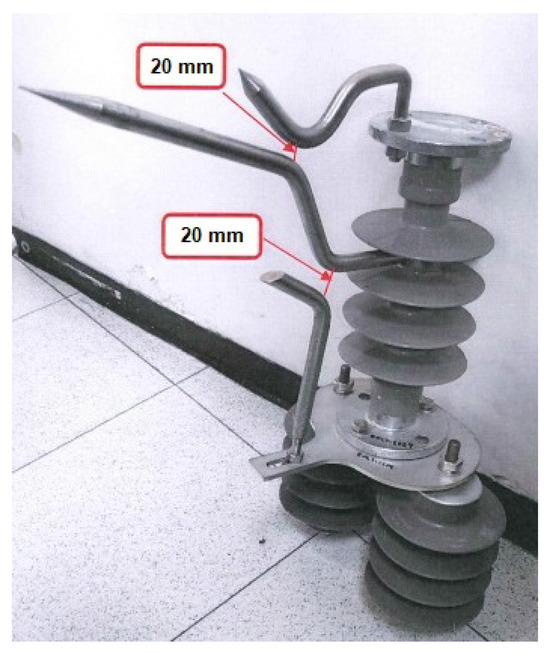 The separation between each pair of electrodes, at the closest points, is 20 mm. Tests were carried out in the laboratory of the National University of Colombia, Bogota, at an altitude of 2600 masl, following the IEC 60060-1 standard [52] to determine the breakdown voltage of the three-electrode gap, alone and with a pin-type insulator in parallel. Appendix C of [27] presents the results of tests performed considering 1.2/50 s standard voltage impulses, with peak values, , in the ranges of 49.5–53.9 kV, negative polarity, and 50.6–61.2 kV, positive polarity. Table 2 summarizes the results for the positive polarity pulses. For each polarity and voltage level, 15 tests were carried out. It was found that the differences between the Basic Insulation Level (BIL) of the three-electrode gap under both polarities was below 4%.