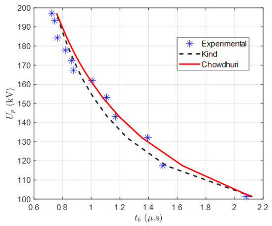 In this case, , is the inductance of the connecting circuit on the high voltage side of the source [27] and is the streamer channel inductance, which is calculated as 1 H/m [37]. The Model block in Figure 5 allows controlling the switch that simulates the dielectric breakdown. The results are illustrated in Figure 6. It can be seen that both models reproduce U-t curves very close to the characteristic curve measured experimentally. However, in the range between 130 kV and 165 kV, Chowdhuri’s model performs better than the Kind’s model and the opposite occurs between 100 kV and 120 kV.