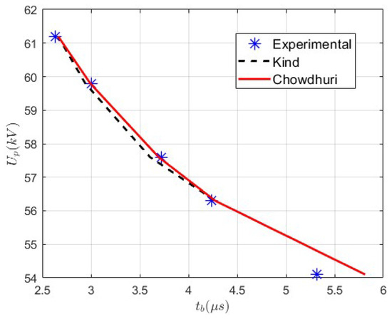 To derive Kind’s and Chowdhuri’s models for the three-electrode gap in Case study 2, the two ordered pairs (4.236 s, 56.3 kV) and (2.630 s, 61.2 kV), taken from the experimental U-t curve defined by Equation (11), were used. These ordered pairs correspond to levels 4 and 7 of Table 2, and were chosen because they have a relative frequency that allows assuming as negligible the stochastic behavior of the dielectric breakdown process. The parameters of the models calculated following the methodology described in Section 4 are shown in the fourth and fifth columns of Table 3. It can be seen that both models for the three-electrode gap have different parameters due to the effect of the exponential function in Equation (3). However, note that the inception voltage obtained with both models is relatively close, with a difference of 4.311%. Furthermore, the value of the objective function, for both cases, is less than 1 × . This evidences that the models can reproduce with a very low error the two ordered pairs on the U-t curve.