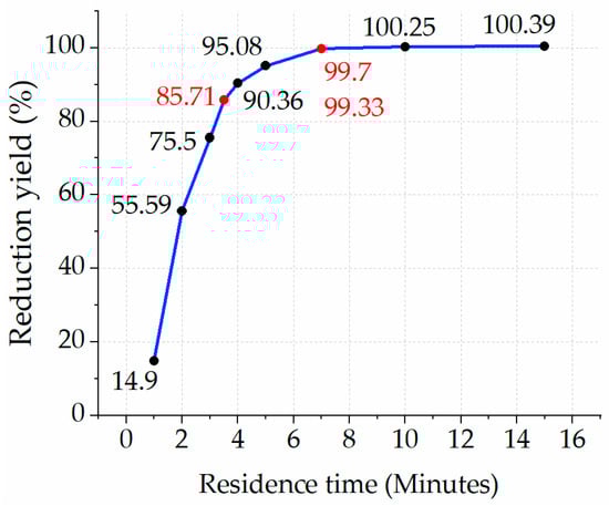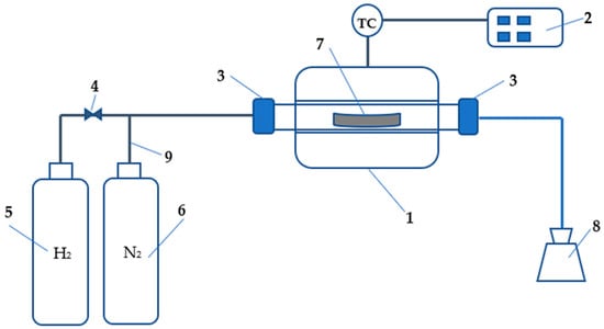 Figure 1 depicts the process flow diagram of the experimental apparatus, building upon the previous research conducted by Alikulov and Xuan []. Experimental conditions were established based on the mass balance of the process, with a ratio of 54 kg of H2 for reducing 1428.00 kg of Fe2O3. The corresponding value of 0.037 g or 0.42 L of H2 was determined for reducing 1 g of Fe2O3. Since the mass flow controller metric was in the standard liter per minute (SLM), the value of 0.42 L of H2 for reducing 1 g of Fe2O3 was multiplied by the residence time of each experiment. If the designed flow rate control range of the mass flow meter was between 5–100% of the nominal value of 20 SLM, then a controlling value of at least 1 SLM must be set up. Ultimately, 1 L of H2 was set up to reduce 2.36 g of Fe2O3. For any residence time value, the amount of feedstock remained the same, and the final decision on optimization was based on multiplying the hydrogen flow rate by the designated residence time. Initially, in this research work, residence times of 5, 10, and 15 min were selected for temperatures ranging from 750 to 800 °C. After conducting a series of experiments, it was decided to focus on a temperature of 770 °C by conducting more detailed, timely experiments within the range of 1 to 7 min. The pressure for the experiments was set at 0.001 MPa. Regarding the structure of the experimental apparatus, Figure 1 depicts details that include a ceramic tube electric furnace (1), temperature controller (2), sealing assembling tools (3), mass flow controller (4), hydrogen cylinder (5), nitrogen cylinder (6), CB boat (7), water container (8), and mechanical valve (9) for controlling the mass flow of nitrogen.