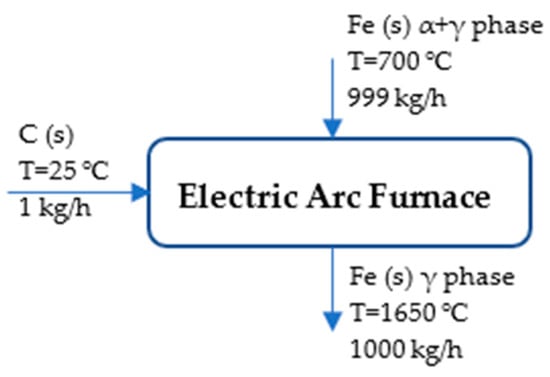 If Q = from Equation (4), as assumed earlier, then the energy required for the conversion of sponge iron to steel is determined by the following equation []: