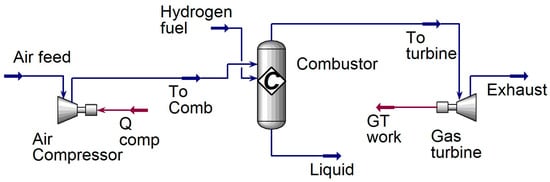 The gas turbine unit of the existing combined heat and power (CHP) plant [] with a 7.6 kW capacity has been selected for developing a 100% hydrogen-fired gas turbine model. Based on the technical specifications of the existing plant, a new model has been designed to evaluate the performance of the cycle. Aspen HYSYS v 8.8 software, utilizing the Peng–Robinson fluid package, was employed to evaluate the technical parameters of the designed model, including the enthalpy and entropy of fluid and fluid mixtures in the cycle. Figure 7 depicts the process flow diagram of the 100% hydrogen-fired gas turbine unit. Technical specifications of the cycle, based on 100% hydrogen combustion, are provided in Table 4. Considering the given technical specification, the specific fuel consumption in the designed model accounted for 1.24 kg/kWh compared to 0.31 kg/kWh in the reference case (i.e., 100% natural gas-fired CHP plant).