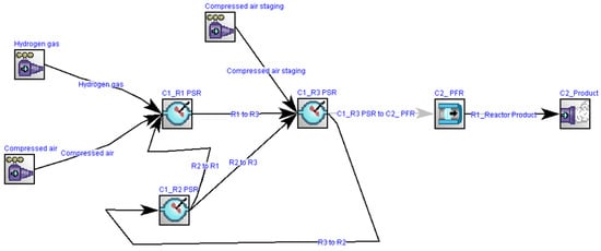 Initially, the energy and mass balances of the process were calculated based on the stoichiometric reactions, namely Equation (1) [] and Equation (2).