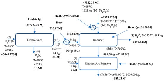First, H2O is split into H2 and O2 using an electrolyzer. Subsequently, the produced hydrogen is employed in the iron ore reduction process, aiming for the production of 1 ton (1000.00 kg) of steel with a composition of 0.999Fe:0.001C.