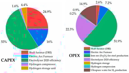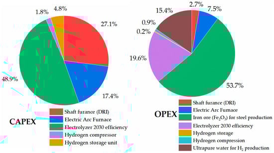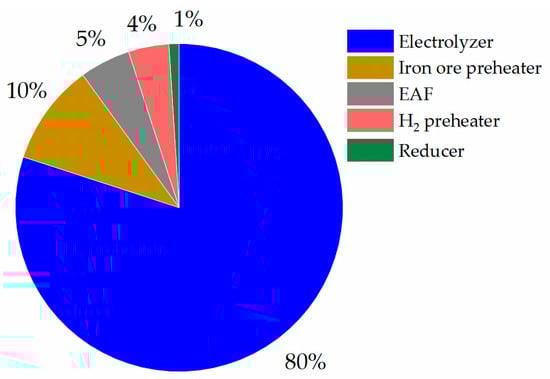 Iron and steel production emit 7% of the global and 16% of the total industrial emissions of CO2 []. Conventional steel production based on the blast furnace–basic oxygen furnace (BF-BOF) route accounts for 70.8% of global ore-based steel production []. The BF-BOF route mainly uses carbon-intensive coke for reducing iron ore and producing steel; therefore, the route is considered one of the most significant carbon-emitting industries, with more than 1.8 tons of CO2 emitted per ton of liquid steel production [,]. Along the BF-BOF route, the direct reduction of iron ore is also emerging, and several approaches on this route have been developed, such as the direct reduction of iron ore with carbon monoxide by using natural gas or a carbon-based reducing agent []. Considering the significant amount of CO2 emissions from the conventional steel sector, the hydrogen direct-reduction iron ore–electric arc furnace (HDRI-EAF) has showcased a positive impact on the steel industry. This is attributed to its use of hydrogen as a reducing agent, replacing carbon-intensive fossil fuels and reducing CO2 emissions by 95–100% [,]. This process offers an opportunity to incorporate renewable energy into the production of green hydrogen, aligning with the demand for sustainable products in the market [].