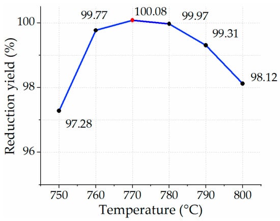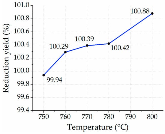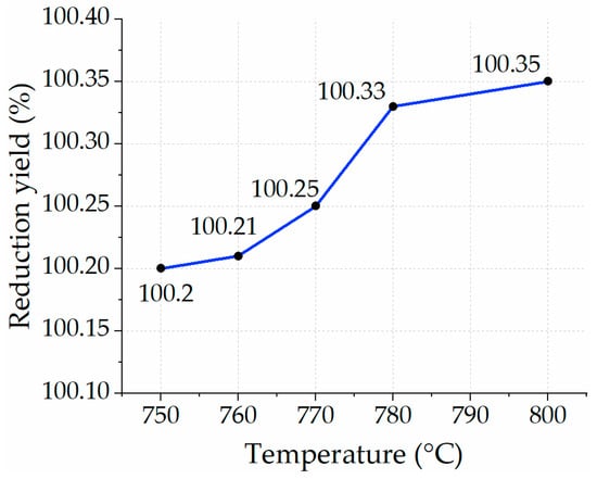 where R represents the yield of reduction, is the total weight loss during hydrogen reduction, and is the total weight of O2 present in Fe2O3. Iron ore is assumed to be pure hematite without any other compositions. The composition of Fe2O3 is 69.9% Fe and 30.1% O2.
