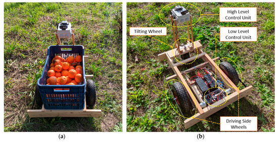 In this regard, the cargo robot can carry a plastic pallet bin full of fruits or vegetables, typically weighting between 10 and 20 kg, between the human collector and the truck, at the speed of a slow-waking man, i.e., at approximately 0.5 m/s. The robot utilizes two sealed lead–acid battery units of 12 V and 7.2 Ah each, allowing for continuous operations of approximately 3 h. The weight of the robotic vehicle, without cargo and batteries, is around 12 kg, its width is 60 cm, its length is 80 cm, its height (from ground to the top of the bin) is 50 cm, while it also has some of its sensing and controlling components at 70 cm above ground, approximately, for better perception of the surrounding environment when working autonomously. The cargo robot maneuvers utilizing a combination of differential steering, via its driving-side wheels, and tilting, via a third wheel, with both mechanisms to be properly synchronized.