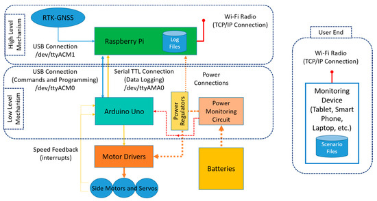 It is worth noting that not all the functionality potential provided by the specific robotic vehicle was necessary for supporting the experiments described in this article, but its architecture allows for a wide range of modifications to better adapt to the energy footprint measuring requirements required herein. Toward this direction, the main controlling and monitoring functions of interest, as well as the additional arrangements being necessary throughout this study, are further explained in Section 2.2.