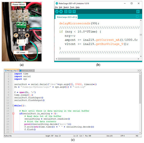 (a) The INA219 measuring circuit as incorporated into the robot; (b) a characteristic microcontroller code part for extracting current and voltage measurements; (c) a Python script for handling the microcontroller-originated logging information.