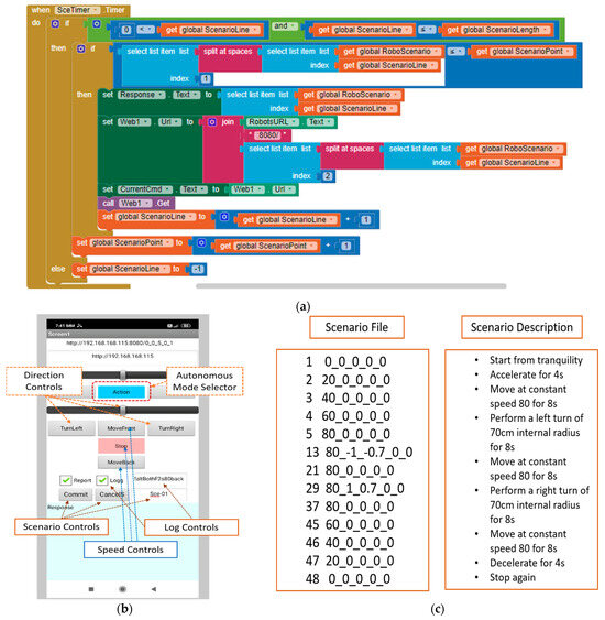 The electric robotic vehicle behavior can be easily controlled and inspected via an in-purpose implemented mobile application using the MIT App Inventor environment [59]. This application was further modified to support the selection and execution of user-defined scenario files. Algorithmically speaking, an additional countdown timer is used to wait for the necessary interval between the consecutive commands that are sent to the robot. The whole scenario has the form of a text file, each line of which corresponds to a specific action of the robotic electric vehicle. The first parameter in each line denotes the time moment that the specific command must be invoked. The granularity of a second is considered enough for the scenarios being planned. Each line command is translated into a TCP/IP request to the listening entity of the robot, i.e., the Raspberry Pi. The option to cancel a scenario under execution is also provided to save time and prevent excessive electromechanical stress and energy losses in case of failures/miscalculations. Prior to prompting for scenario execution, the user should activate the file logging operation and deactivate it after scenario completion. An instance of the corresponding code blocks, the application’s interface, and an indicative scenario file are depicted in Figure 4a, Figure 4b, and Figure 4c, respectively.