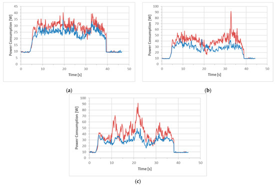 Power consumption with (red color) and without (blue color) cargo for the U-turn scenario on the following: (a) asphalt terrain; (b) grass terrain; (c) rough field terrain.