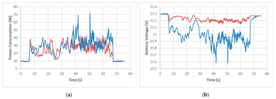 Comparative energy diagrams between lead–acid (blue color) and LiPo (red color) batteries during the robot’s straight-line movement in 10% inclined asphalt terrain with 80% of its maximum speed and without cargo: (a) power consumption in Watt; (b) battery voltage in Volt.