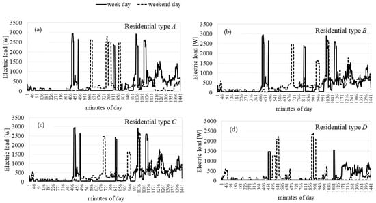 With regard to the electricity load of residential buildings, the electric load of a typical winter day for the residential user type is detailed in the Section 4, distinguishing between the week and weekend days (Figure 4).