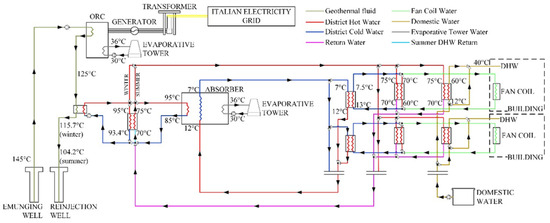 The proposed system (Figure 6) comprises an ORC, the combined production of electric energy, and a grid for the distribution of cooling and thermal energy. The geothermal- ORC system is a sophisticated and integrated energy solution. It primarily serves the REC by meeting its electricity demands. The system works in a cascade, wherein it generates electricity and supports a district heating network. This network provides heating, cooling, and domestic hot water to eight buildings.