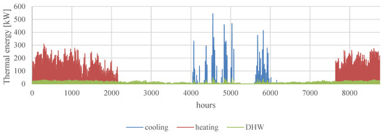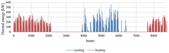 The climatic data considered for the simulations refer to the climatic year on an hourly basis developed by the “Italian Technical Committee” (CTI) in 2015. The respective monthly average values are contained in UNI 10349-1 [33]. In the evaluation, it was assumed that in the heating season the temperature of regulation was set to 20 °C during the hours of operation of the plant, and to 26 °C in the summer season.