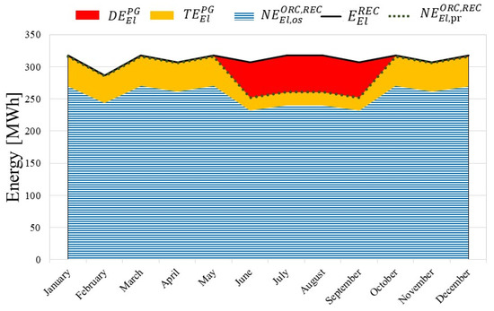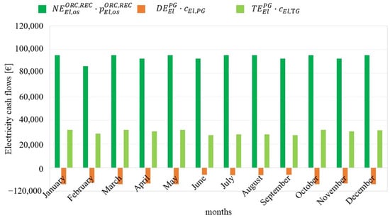 The monthly value of electricity cash flow is reported for the C#1 case in Figure 12. The electricity sharing allows for a monthly income, which includes the sharing incentive and income for electricity sold to the PG, for the community even higher than 85,000 € (green bars). The electricity cost for energy taken from the PG (orange bars) is higher during the winter period than in summer (for example, 13,922 € in January and 6223 € in August). The electricity sold to the PG (light green bars) assumes a lower value during the summer period due to lower available electricity from the ORC, depending on higher self-consumption of auxiliaries.