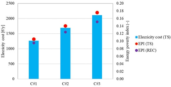 For the socio-economic analysis, a residential user family with a minimum income of 12,000 €/y is considered. The energy yearly electric load is equal to 4220 kWh/y, which represents 0.13% of global REC consumption and, assuming a democratic redistribution of REC income, it could be represent a share of family income from REC by excluding the operating and maintenance cost. The user spends 1266, 1688, and 2110 €/y, respectively, for C#1, C#2, and C#3 on the electricity bill, and he obtains (in the best case, with global income given to members) about 1237 €/y, 1580 €/y, and 1935 €/y for C#1, C#2, and C#3 that could be added to his personal income. The results show that the EPI suggests rapidly passing from TS to REC conditions as, as reported in Figure 13, a reduction equal to 9%, 12%, and 14%, respectively, for C#1, C#2, and C#3 is presented.
