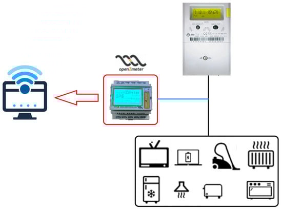 - Installation of the smart meters: Considering that our aim is to conduct measurements on the loads within the microgrid, an openZmeter device is utilized for monitoring these loads. For instance, Figure 1 illustrates how the openZmeter captures energy data from home appliances at a single point, which is then transmitted to a computer that will process the data received. With this, homeowners can access and view energy consumption data at any time and receive alerts if any of the parameters are out of normal range through a web page or mobile application linked to the smart meter. Furthermore, the openZmeter can also be employed to monitor the power generated by renewable energy sources.