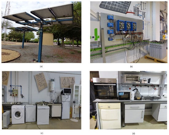 The experimental study was carried out in the laboratory microgrid of the University of Almería (Spain) (latitude: 36°49′45″ N, longitude: 2°24′28″ W). Almería is one of the locations in Europe with long hours of daylight (more than 3000 h annually) []. Figure 2 shows the main elements of the microgrid. Firstly, Figure 2a shows the generation system that consists of two solar tracker systems with 3600 watts capacity each. Three wind turbines (model Wind 13+, manufactured by the Spanish brand Bornay) can also be connected to the microgrid. The energy generated and not consumed is stored in batteries for later use (see Figure 2b). The arrangement of loads in the microgrid incorporates several home appliances like fridges, refrigerators, ovens, electronic devices, etc. (see Figure 2c,d). These devices harness energy from renewable sources or batteries, in addition to the building’s own electrical connection.