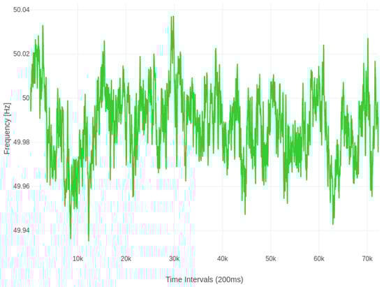 Furthermore, the openZmeter is capable of capturing power quality data, as per the EN50160 power quality standard, which is of significant importance in the microgrid context. For instance, Figure 6 illustrates the frequency variation within the microgrid relative to the standard 50 Hz frequency (commonly observed in Spain and many other electricity systems worldwide). It is evident that the frequency remains close to—but slightly below—the reference value for most of the experiment duration.