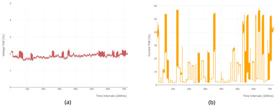 The openZmeter is capable of collecting data on other power quality variables, such as total harmonic distortion (THD), in terms of current and voltage. THD numerically represents the harmonic distortion present in a signal, and its presence can lead to issues such as increased current, excessive heat, and other inconveniences that could cause damage to equipment and systems. Figure 7a displays the THD of the voltage during the experiment, where it can be observed that the values are below 2.5%. Meanwhile, Figure 7b illustrates that the THD of the current is sometimes higher than 50%.