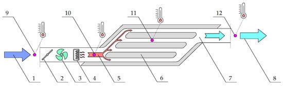 Diagram of surface air heating without recirculation: 1—outdoor air, 2—throttle, 3—fan, 4—electric heater, 5—air collector, 6—mock-up of surface heating, 7—air collector, 8—exhaust of air outside, 9—measurement of initial temperature and airflow, 10—thermostat and measurement of temperature, 11, 12—measurement of temperature.