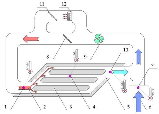 Diagram of surface air heating with recirculation: 1—measurement of temperature, 2—air collector, 3—mock-up of surface heating, 4—measurement of temperature, 5—air collector, 6—outdoor air, 7—measurement of initial temperature and airflow, 8—throttle, 9—fan, 10—measurement of temperature, 11—throttle, 12—electric heater.