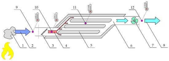Block diagram of heating by means of flue gas from a pellet-fired boiler: 1—pellet fireplace, 2—smoke from burning pellets, 3—throttle, 4—air collector, 5—mock-up of surface heating, 6—air collector, 7—fan, 8—exhaust of air outside, 9—measurement of initial temperature and airflow, 10—thermostat and measurement of temperature, 11, 12—measurement of temperature.