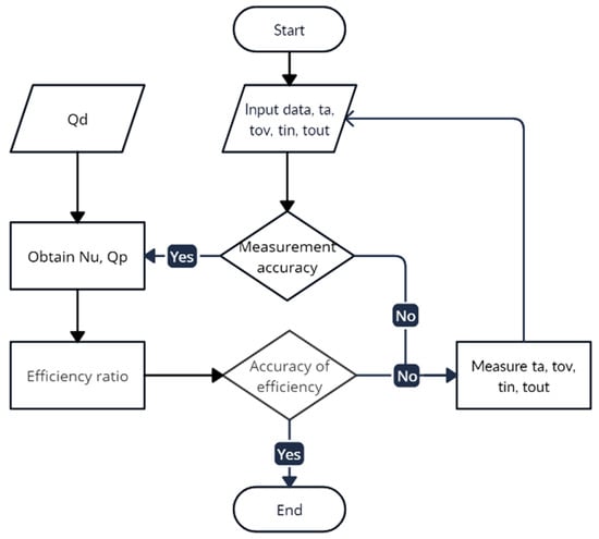 Depending on the product of the Grashof number and Prandtl number, values for the constants C and n used in calculations were determined according to Equation (1) based on the available literature data. It should be noted that the correlation of the Nusselt number may be a source of errors resulting from the determination of the Pr and Gr numbers, which in turn are closely related to the fluid parameters. These errors will be even greater when the fluid parameters are dynamically changed, which takes place at the beginning of the experiments in the heat transfer stabilization phase. When stable conditions are reached, for which the efficiency of individual variants of the experiment was determined, Nu achieves statistically the highest accuracy throughout the entire experiment, which the authors are aware of. Therefore, the efficiency values are determined after heat transfer stabilization is achieved, where the dynamics of changes are the smallest.