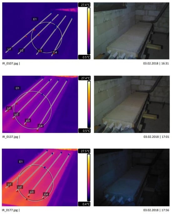 At the start of the experiment, the initial room temperature was stabilized at 4 °C. The parameters of the mock-up heating process were monitored using a Flir E30bx thermal camera with an accuracy of 0.1 K, an Airflow LCA301 thermal anemometer with an accuracy of 0.1 K and 0.05 m/s, and an on-wall room temperature sensor Auraton 2005 with an accuracy of 0.1 K.