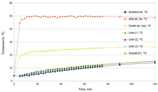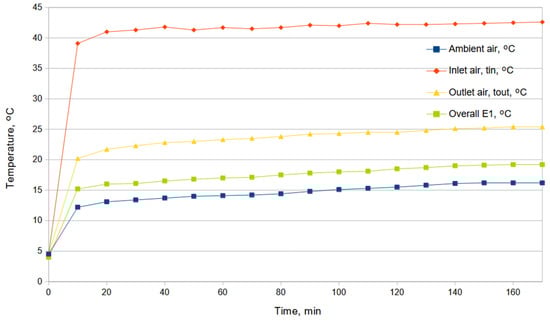 Stable measurement conditions were achieved approximately 20 min after the start of the experiment. A portion of the heat required to warm the plate was obtained from the recirculation of the air leaving the plate. This was achieved by recirculating 100% of the air, which reduced the heat demand by lowering the inlet temperature to the heater by approximately 30% compared to Variant 1.